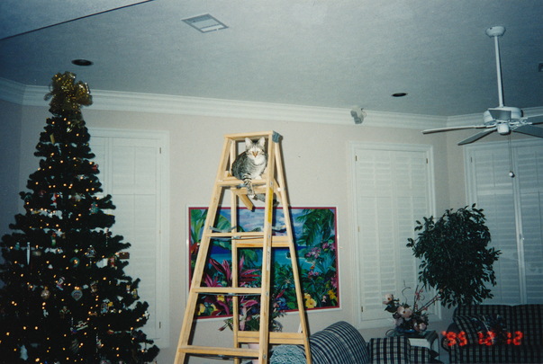 The grey cat is on the ladder in the middle of the room which has a Christmas tree in it.
