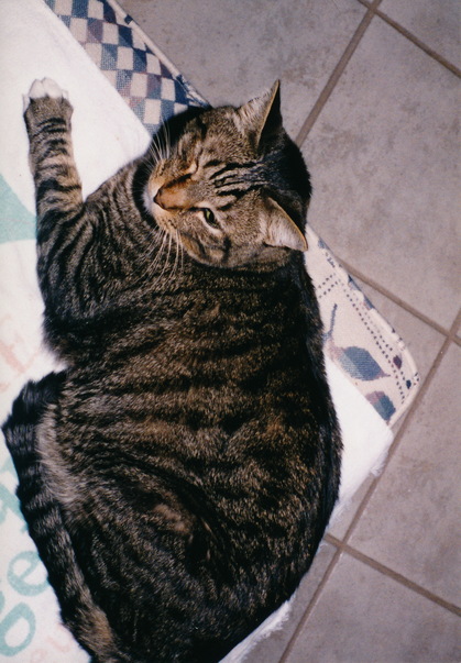 A lazy tabby cat lies napping on a blue and white blanket.
