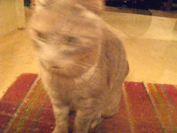 blurry image of a gray cat sitting on a colorful rug |