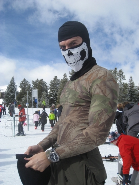 An adult man wearing a black ski mask with a skeletal design at a ski resort |