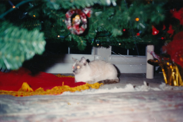 A Siamese cat resting under a Christmas tree on a red and gold Christmas tree skirt.