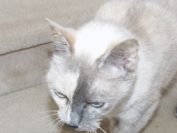 The small cat is white and grey in color and has eyes that are blue in color. |