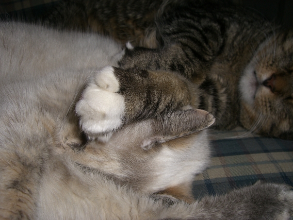 Two cats sleep together, one has its paw on the other, the paw is tipped with white. |