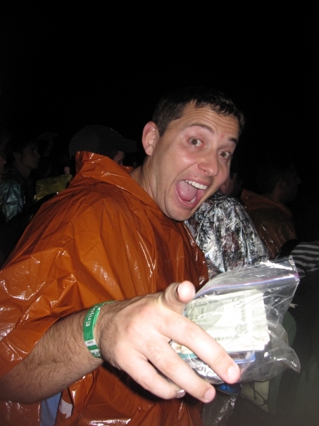 A man wearing an orange plastic raincoat and a green band holds some money covered in a plastic bag in his right hand. |