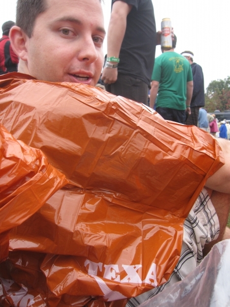 the guys is wearing orange T- shirt and sitting on the ground and enjoying