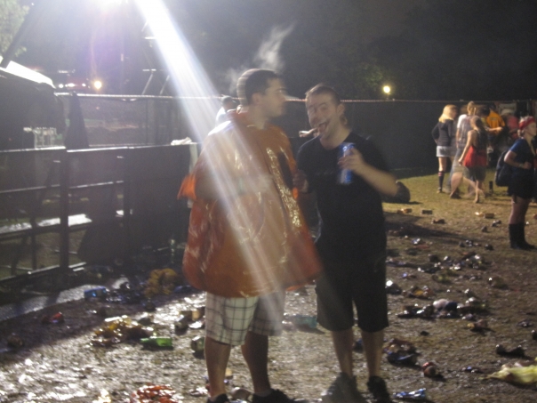 Two guys stqanding outside in what appeasrs to be a concert area. There aren't many people standing around but the ground is littered in trash and it's wet and muddy. The one guy is waring a rain jacket and watching the crowd or somethingout of view and the other guy is staring at the camera with a big smile on his face, his tongue out, and a can in his hand. |