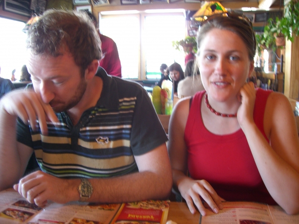 A couple eating dinner with an annoying camera-phone using maniac. |